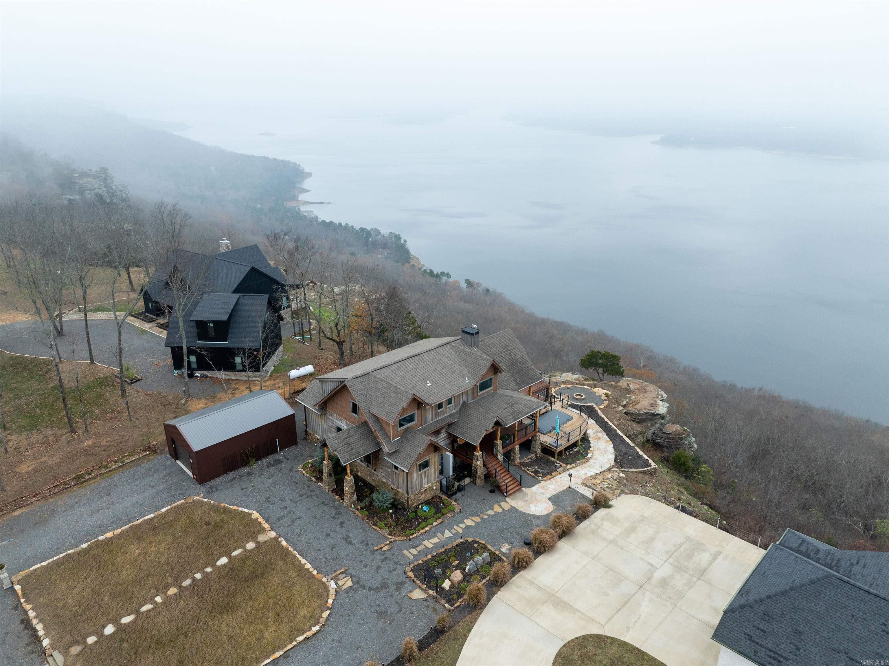 This architectural masterpiece of rugged elegance commands panoramic, unobstructed views of Greers Ferry Lake and the timeless Ozark Mountains. This 2,468 sq ft log-style showpiece blends mountain craftsmanship with refined luxury, offering a front-row seat to sapphire waters and endless horizons—just minutes from top marinas. Walls of windows and soaring wood ceilings bathe the open living spaces in natural light, centered by a dramatic wood-burning fireplace that flows seamlessly to a second outdoor hearth on the expansive wraparound decks. The gourmet chef’s kitchen dazzles with granite counters, a full-size butler’s pantry, double ovens, gas convection range, and a grand island perfect for gatherings. All Bedroom suites all feature spa-like walk-in shower. Descend to the walkout lower level or indulge in the endless swimming pool, delivering resort-style currents against a breathtaking lake backdrop. Uncompromising quality throughout: Perma-seal encapsulation on the entire home, whole-house Generac generator, automated blinds, fiber internet, and a handicap-accessible entryway. This is not just a home—it is a legacy sanctuary of unparalleled craftsmanship and timeless beauty.